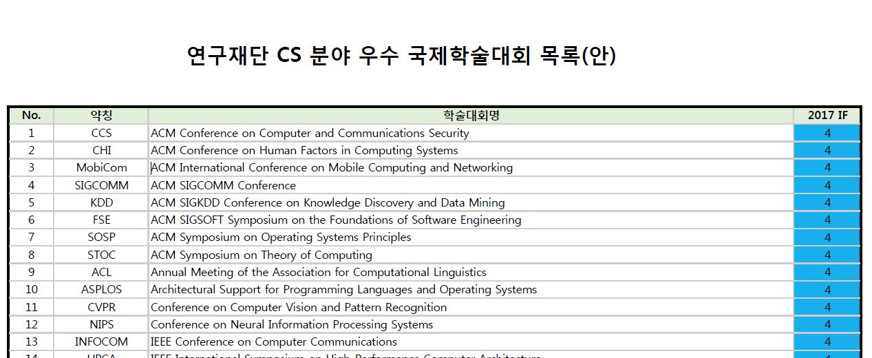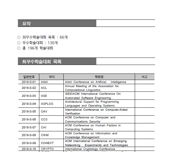 한국정보과학회에서 관리하는 목록으로, 2018년 12월에 개정되었습니다. IF는 부여하지 않고 최우수 학회와 우수학회 두 가지로 분류합니다.