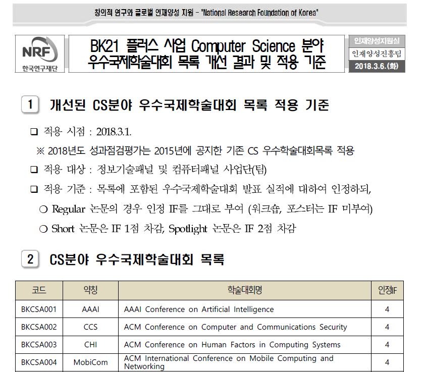 한국연구재단에서 관리하는 목록으로 2017년에 개정되었습니다. BK 대부분 유사합니다. 연구재단 리스트로 IF를 1~4로 부여하고 있습니다.